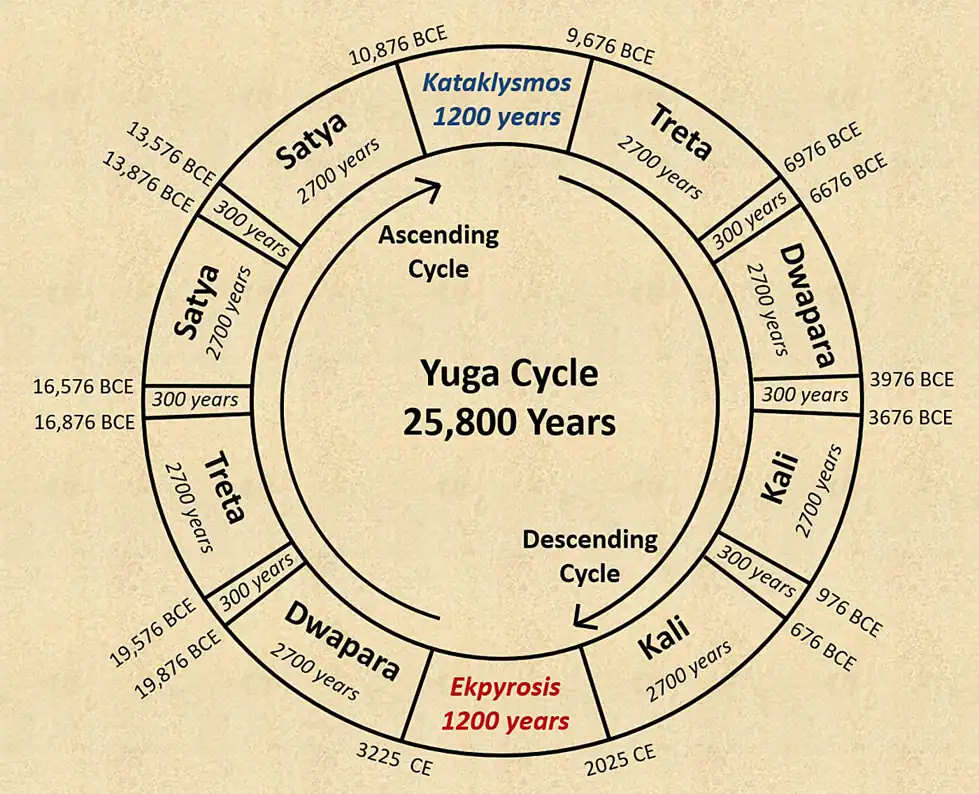 На противоположном конце света древнеиндийские цивилизации отображали время в еще более широком масштабе. Циклы Юги, описанные в индуистской космологии, делили продолжительность жизни мира на четыре великие эпохи: Сатья-юга, Трета-юга, Двапара-юга и Кали-юга.