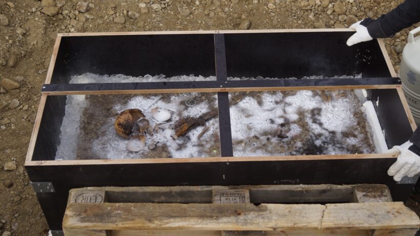 Археологи штата решили заморозить содержимое всей погребальной камеры с помощью жидкого азота, чтобы ее можно было раскопать как единый блок в течение 14 часов. Исследователи использовали жидкий азот, поскольку его температура в минус 320 градусов по Фаренгейту (минус 196 градусов по Цельсию) не позволяет замерзающей воде создавать крупные и разрушительные кристаллы льда, говорится в заявлении.