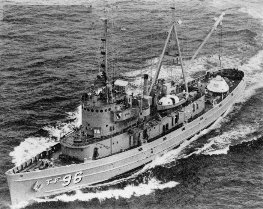 - USS Abnaki (ATF-96) на ходу 12 января 1971 года после спасения космического корабля. В данном случае — макета капсулы Apollo. Фото: Public Domain.