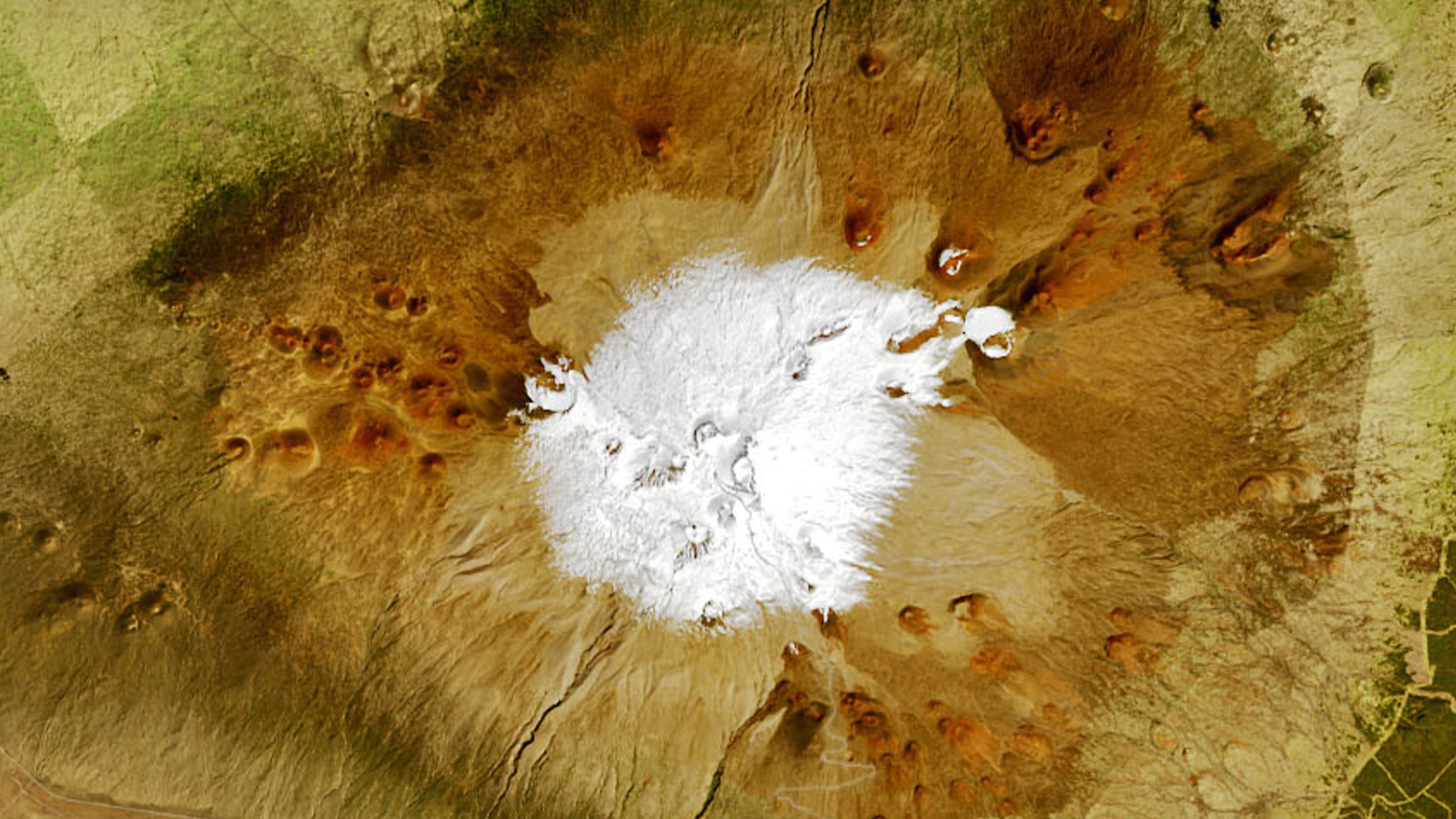 Когда была сделана эта фотография, общее количество снега, покрывавшего обе вершины, достигло второго по величине показателя для этого времени года с начала ведения учета в 2001 году, согласно данным Обсерватории Земли НАСА. В пик предыдущей метели на вершинах обоих вулканов за один день выпало до 2 футов (0,6 м) снега.