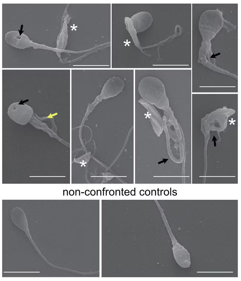 Сперматозоиды, подвергшиеся воздействию Toxoplasma. Стрелки указывают на отверстия и другие повреждения сперматозоидов; звездочки — на места проникновения паразита. Два неконфликтных контроля внизу показывают нормальные сперматозоиды. (Изображение предоставлено: Rojas-Barón et al/The FEBS Journal, CC BY-SA).