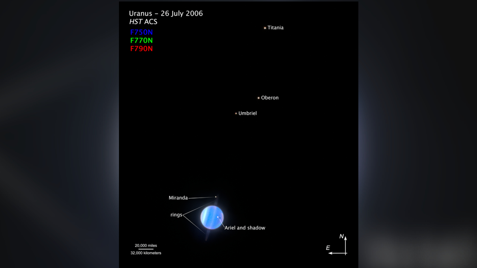 У Урана 28 подтвержденных лун, включая пять крупных. Самый близкий из этих крупных спутников — Миранда, за ней следуют Ариэль, Умбриэль, Титания и Оберон — все они названы в честь персонажей пьес Уильяма Шекспира. Все эти ледяные тела шириной от 293 до 980 миль (от 472 до 1 578 километров) «приливно-отливным образом» связаны с Ураном, то есть одна и та же половина луны всегда обращена к планете, подобно тому, как земная луна вращается вокруг нашей планеты.