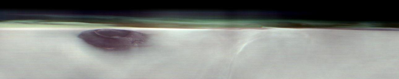 В 2023 году Odyssey начал делать снимки горизонта Марса («лимба») с высокой орбиты, подобные этому. Поскольку камеры зонда предназначены для съёмки поверхности, запечатлеть облака непросто. Для этого аппарат разворачивается на 90 градусов, чтобы его инструменты могли зафиксировать слои атмосферы, включая пыль и водяной лёд.